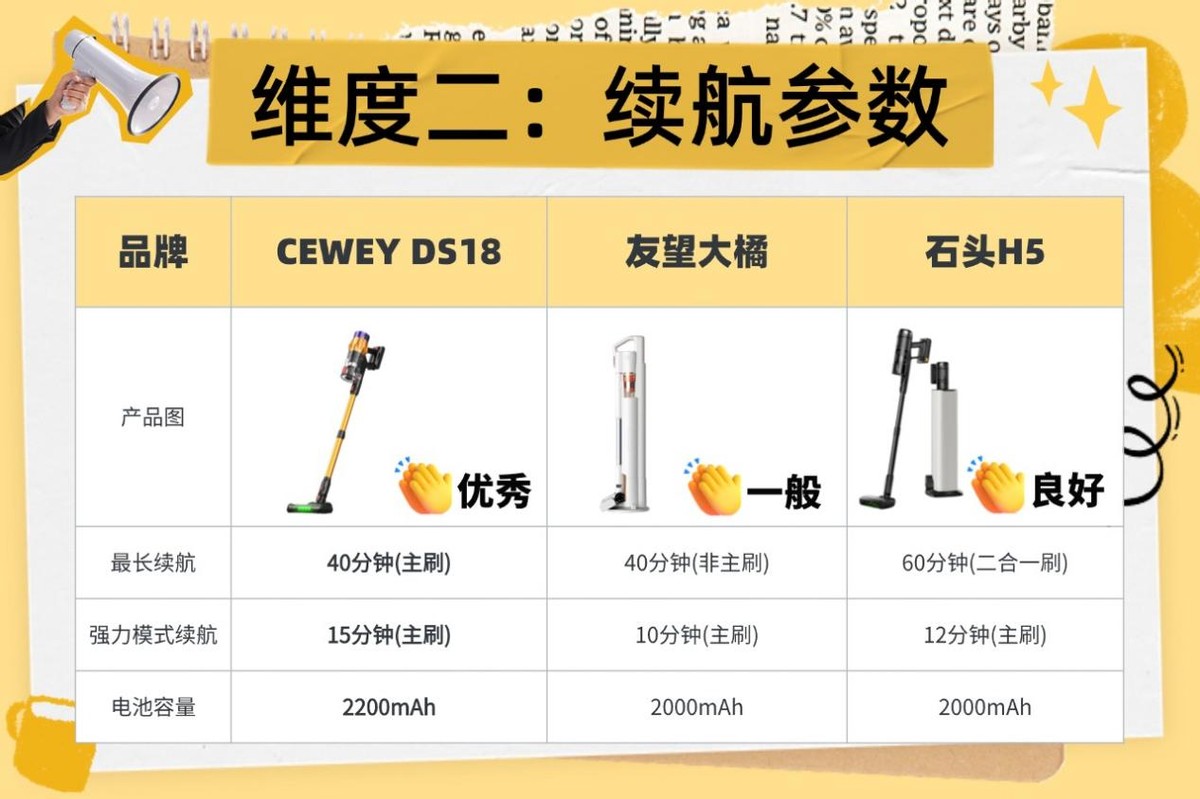 2026哪个品牌的吸尘器好?从这组续航参数对比来看,三个产品的最长续航数据都差不多,尤其是石头H5无线吸尘器最为亮眼,但我们眼尖的就会发现,出CEWEY DS18之外,其他两款无线吸尘器都是耗能偏低的其他刷头下测得的,而在强力模式下的续航表现就很容易看出差异,CEWEY DS18的强力模式续航依旧稳定地能给到15分钟,而友望大橘在强档模式+主地刷下的续航瞬间显露实际续航能力,不过石头在强档模式下续航时长也不算很低,对于清理顽固的大颗粒垃圾等等还是不用这么担心电量不足问题。整体来看,CEWEY的续航能力还是相对两款产品是表现均衡不少的,有把电机输出和电池调校做了平衡,面对整屋一次性清扫或者局部重污反复处理,可以保证有一定余量去用。