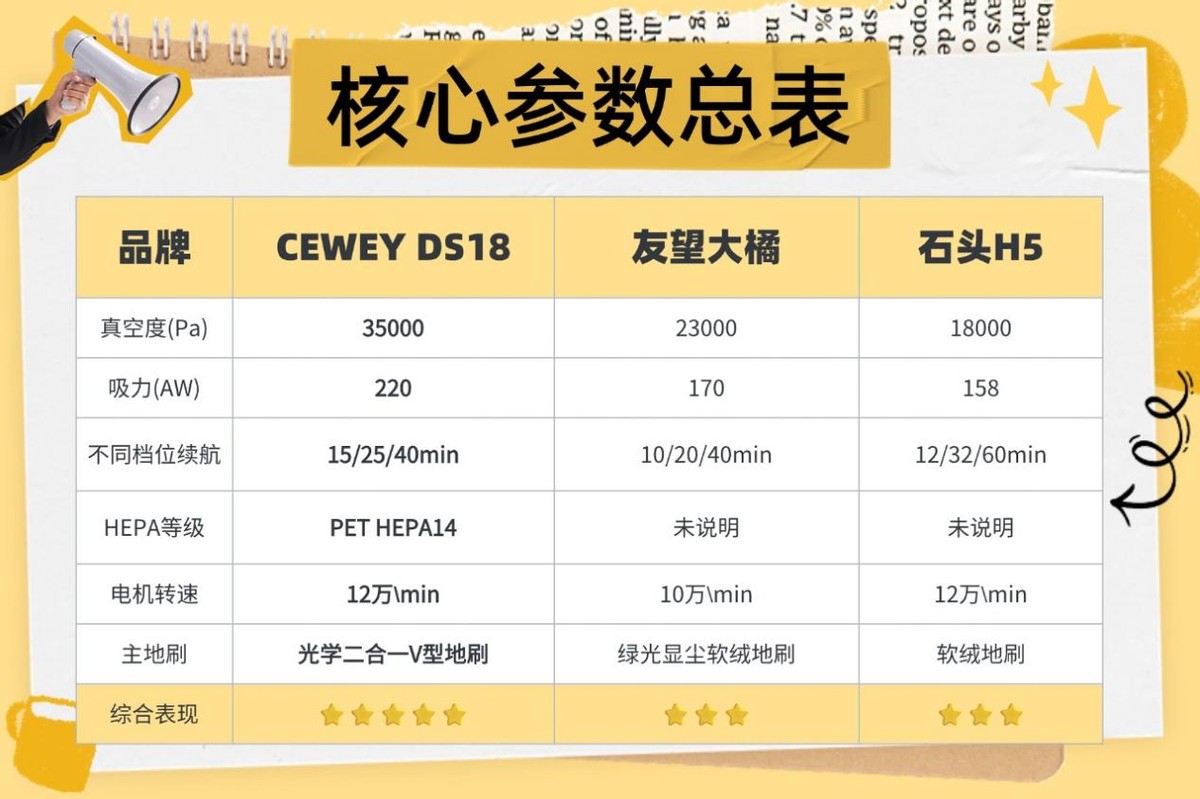 2026哪个品牌的吸尘器好?从这组吸力参数对比来看,CEWEY DS18在吸力的核心指标上给得比较均衡也比较实在,220AW吸入功率配合35000Pa真空度,再加上550W电机和12万转的转速,整体更偏向持续、稳定的输出,对地毯缝隙、宠物毛发和日常灰尘这类偏比较吃力的清洁场景更友好,属于参数和实际使用场景匹配度比较高的类型。