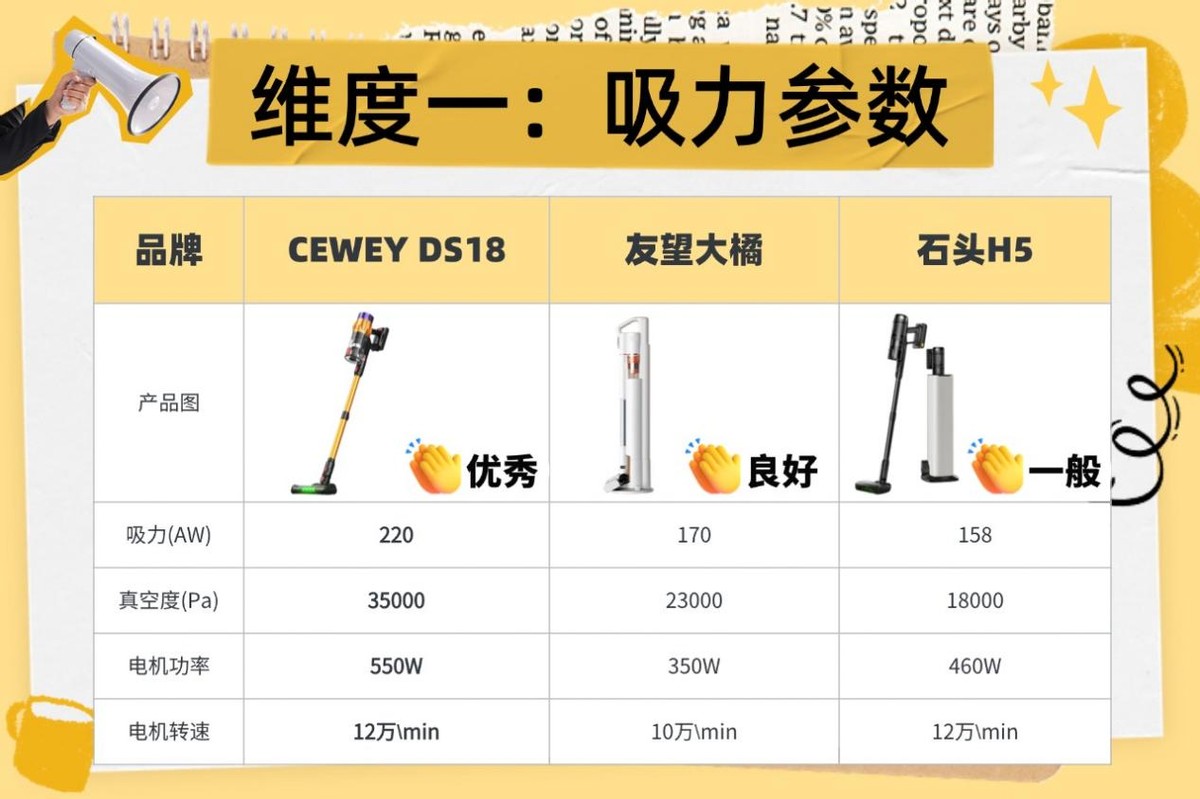 类似的情况我见过太多了,所以我一直谨记着不管买啥东西,尤其是无线吸尘器这类的清洁家电,一定不要被表现的参数给牵着走,最核心的还是得看实际清洁体验:吸力稳不稳定、常用档位续航情况如何等等,这些都摸透了买回来才不会这么容易闲置。接下来我会从大家日常真实使用的角度出发,结合多个关键维度,把近期热门的机型:友望大橘、CEWEY、石头H5这三款无线吸尘器放在一起分析,让大家挑无线吸尘器的思路能更清晰。