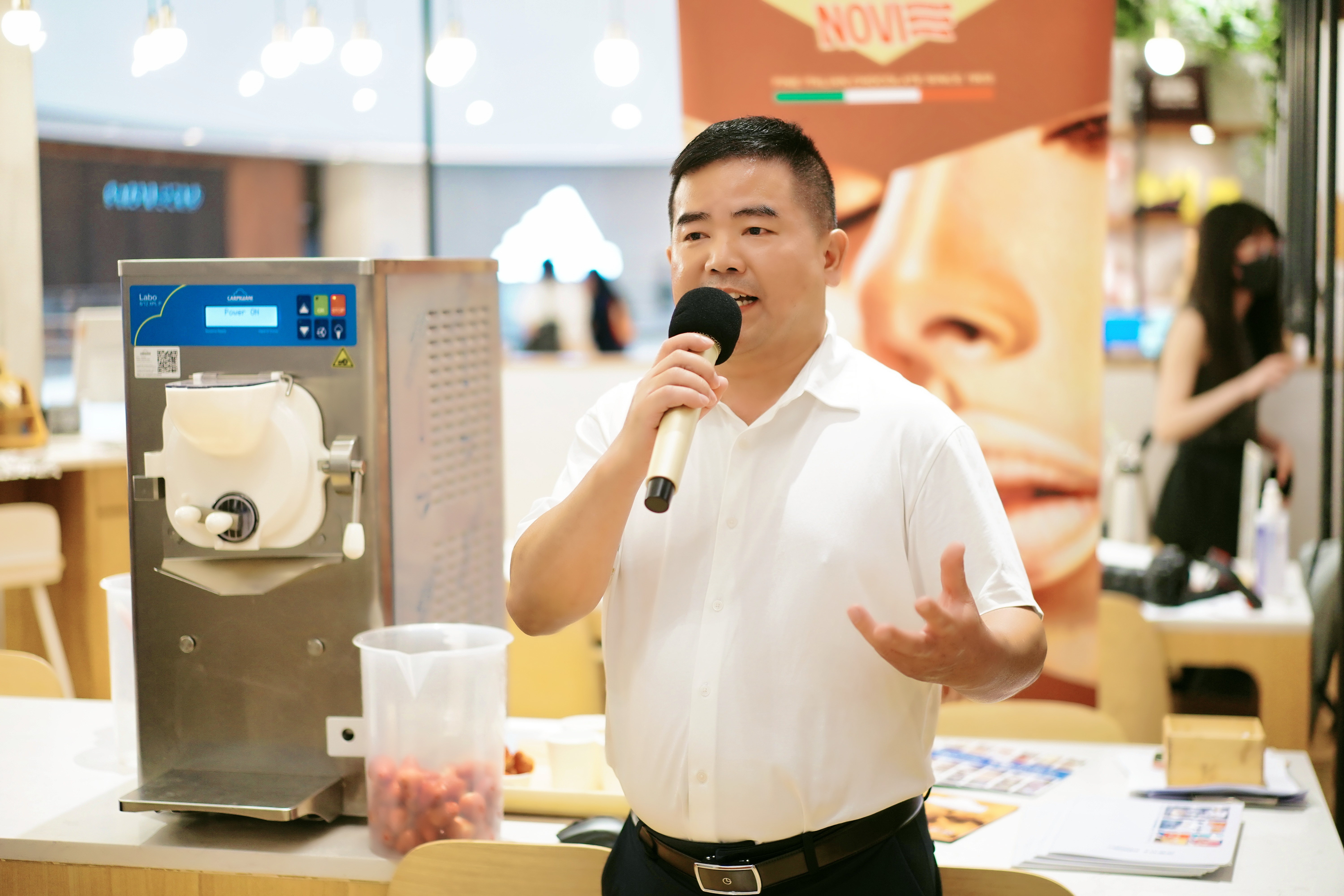 接近尾声的时候,来自卡比詹尼公司的张名锋先生介绍了他们的冰淇淋机,并现场展示如何制作手工意大利冰淇淋。
