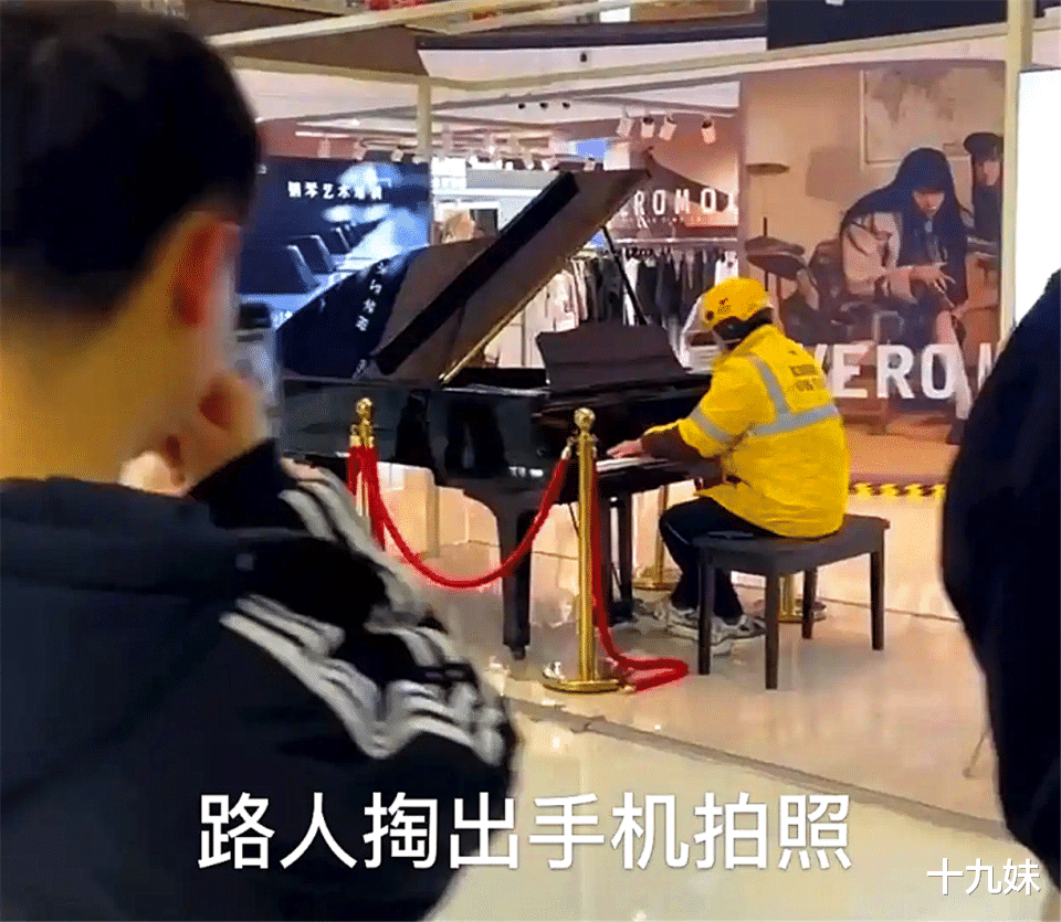 好奇的路人纷纷驻足,顺着琴声望去,一个意想不到的身影映入眼帘。在一个琴行门口,有人正忘我地弹奏钢琴。不过,他不是优雅的钢琴师,而是一位头戴头盔,一身明黄色骑士制服的外卖小哥。