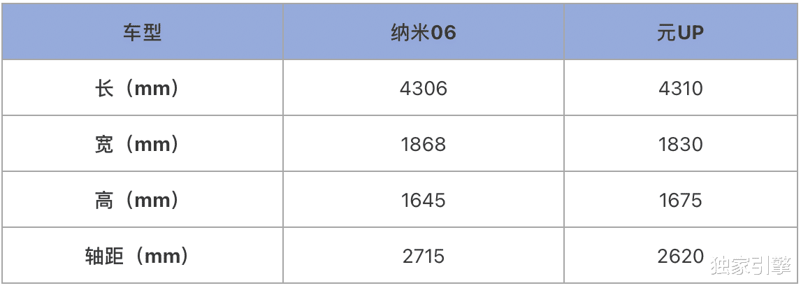 首先,纳米06的车身尺寸为4306mm、1868mm、1645mm,轴距为2715mm,元UP车身尺寸为4310mm、1830mm、1675mm,轴距为2620mm。