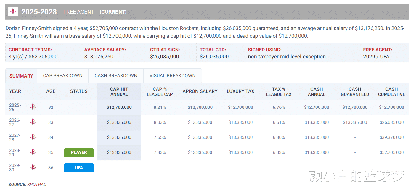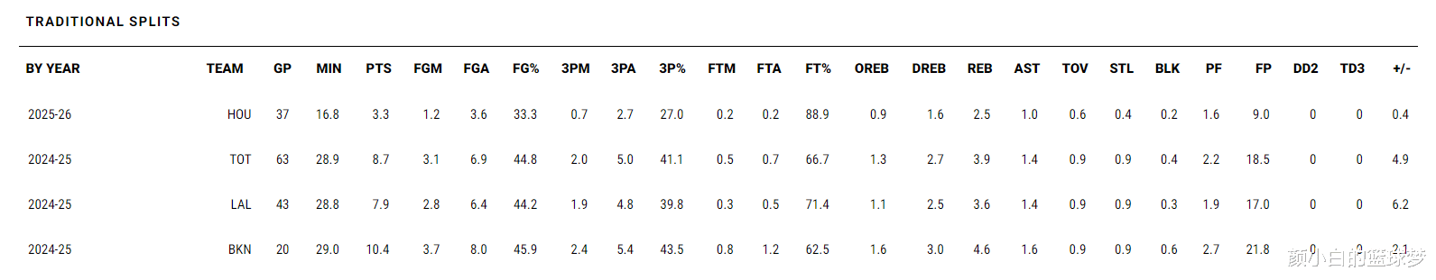 结果芬尼-史密斯2025年12月26日复出后他只打了37场比赛,场均16.8分钟,拿到3.3分2.5篮板1助攻0.4抢断0.2盖帽,命中率33.3%,三分命中率27%。他在火箭队的战术地位比上赛季在湖人差不少。
