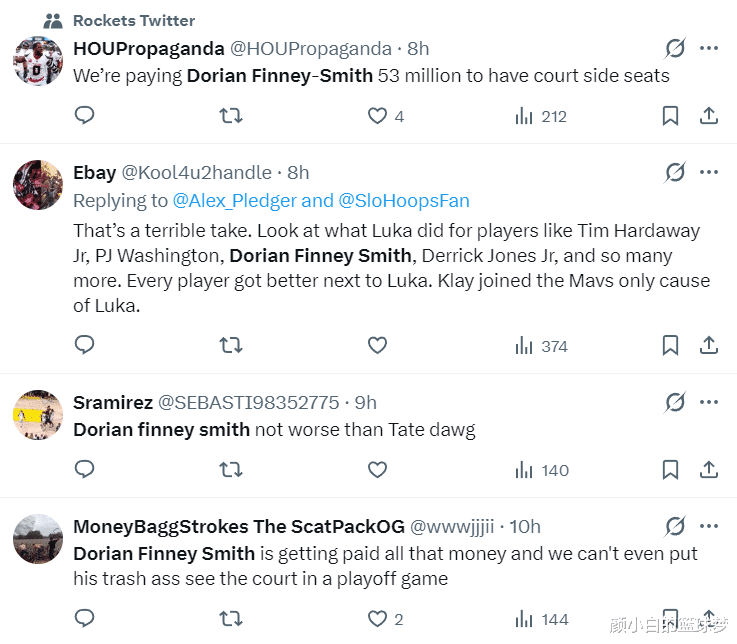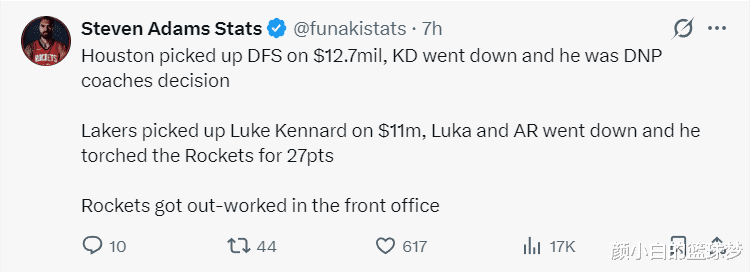 休媒:芬尼本赛季薪水1270万,KD受伤缺席乌度卡却DNP他。湖人交易得到年薪1100万的肯纳德,但东契奇/里夫斯缺席他狂砍27分痛击火箭。火箭管理层运作太差劲。