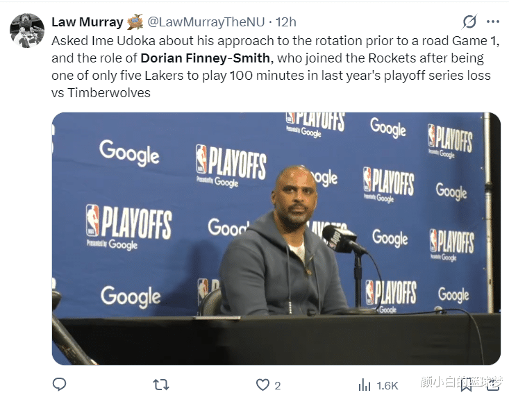 快船记者劳里-穆雷写道:芬尼-史密斯是湖人去年季后赛唯一一个登场时间超过100分钟的角色球员,而他加盟火箭后已经沦为饮水机,乌度卡还曾谈论过芬尼在球队轮换地位降低的话题。