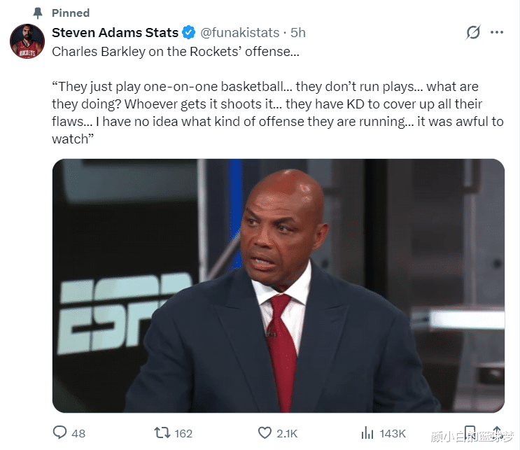 巴克利谈到火箭:他们只是在进行1V1的篮球比赛,球队没有任何的战术配合,谁拿球就谁单干。他们有杜兰特时可以弥补他们的不足,我完全不知道他们有什么进攻体系,看他们打球太难受了。