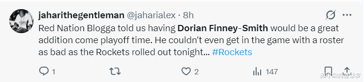 火箭球迷们疯狂的朝着斯通开炮:去年火箭队告诉我们签下芬尼-史密斯会在季后赛阶段发挥很大功效。而在杜兰特无法登场轮换糟糕的情况下,乌度卡居然都不用芬尼。