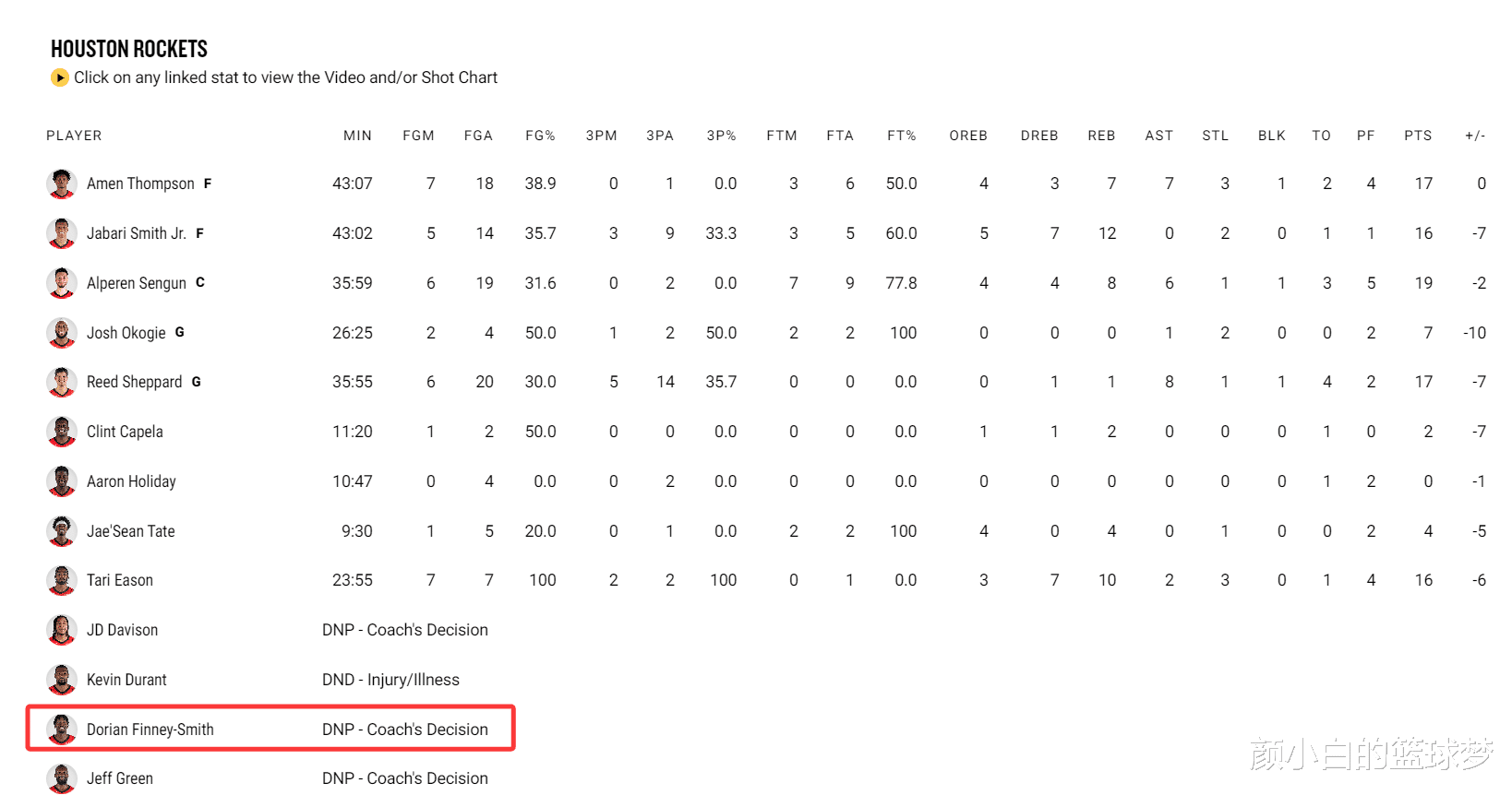 这场比赛火箭队被DNP的有三人:JD-戴维森、芬尼-史密斯、杰夫-格林。芬尼-史密斯是去年夏天火箭以四年5300万签下的2D锋线,乌度卡信誓旦旦的说芬尼-史密斯是休赛期最佳引援之一,他伤愈复出后会成为火箭的主力轮换。