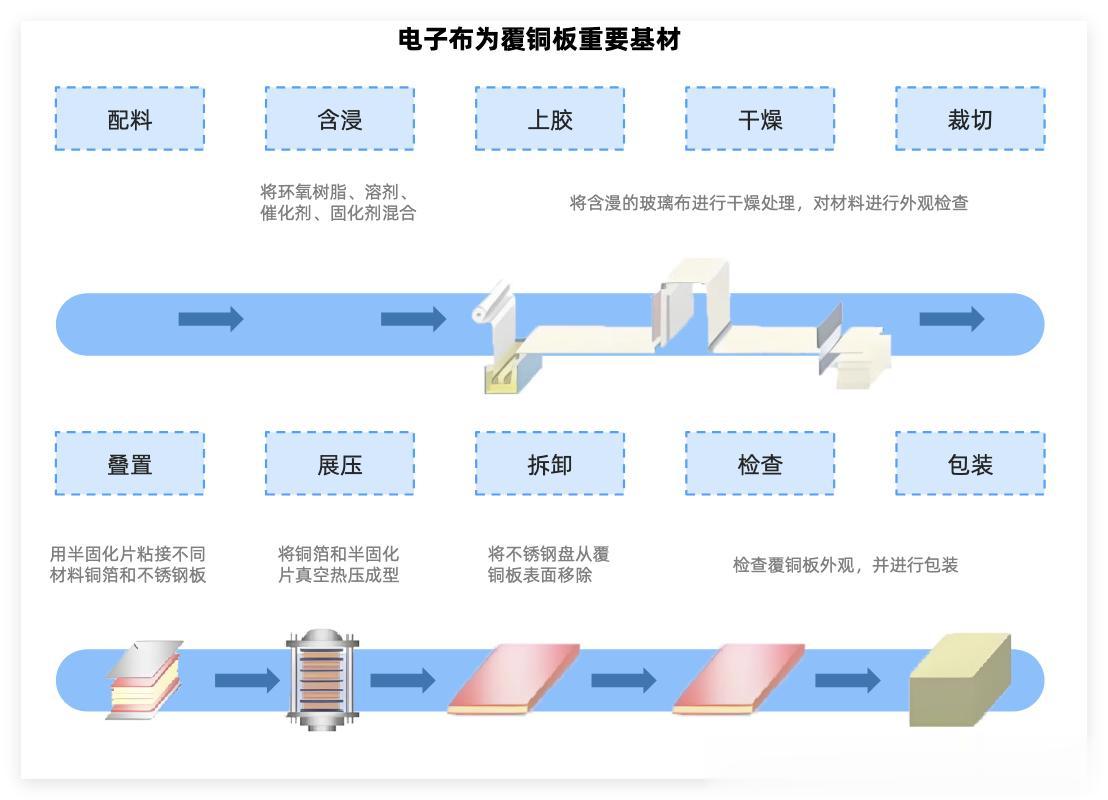 电子布是PCB的核心基材,由超细电子级玻璃纤维纱织造而成,与树脂复合后形成覆铜板(CCL),再通过蚀刻、钻孔等工艺制成PCB。
