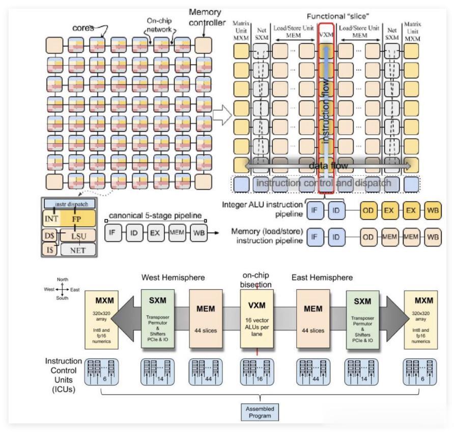 LPU的张量流处理器(TSP)的架构(右图)对比传统GPU采用多核布局(左图):