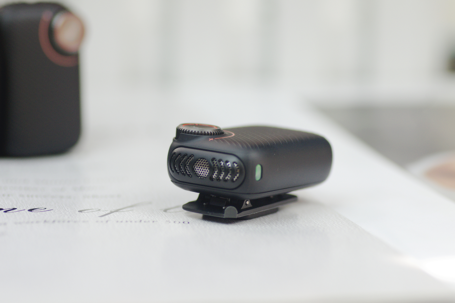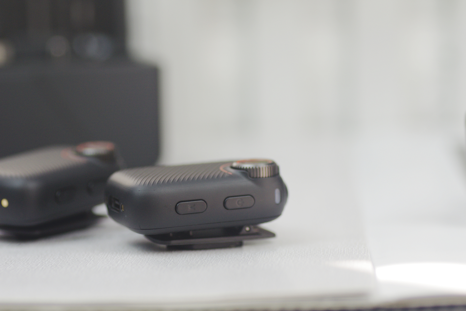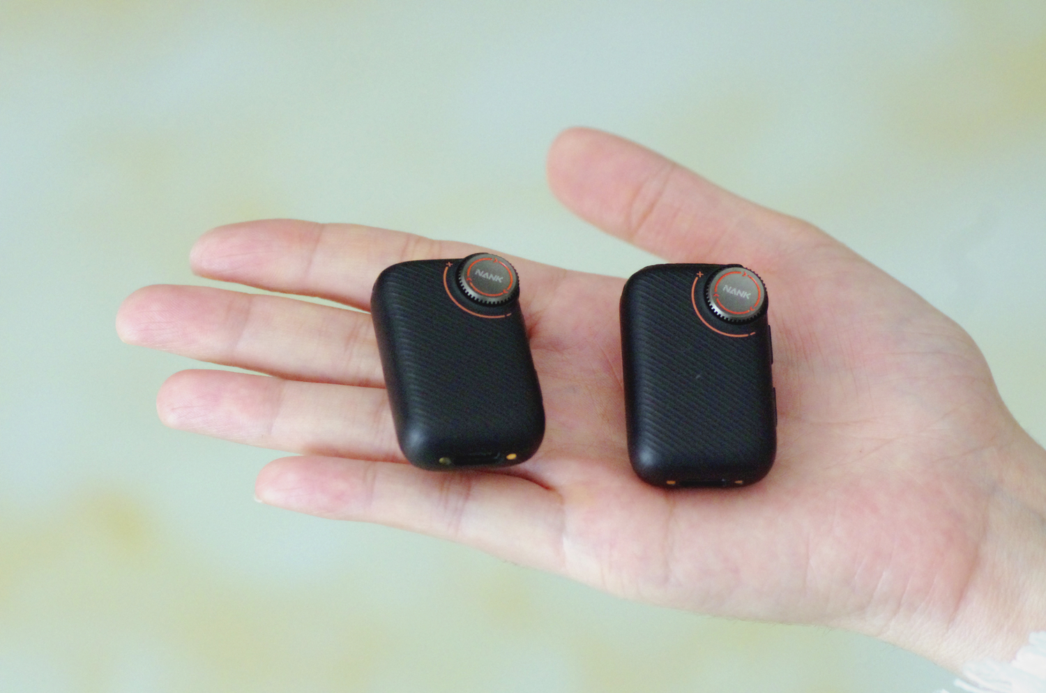 南卡Qmic的麦克风体积大约是46*29*15mm,23g不到,整体非常小巧轻量。正面是一个增益旋钮,细腻阻尼感的手动调节滑轮,可快速调节20档增益,覆盖10dB至+dB动态范围,以录音棚及1.0dB精度实现全场景匹配。