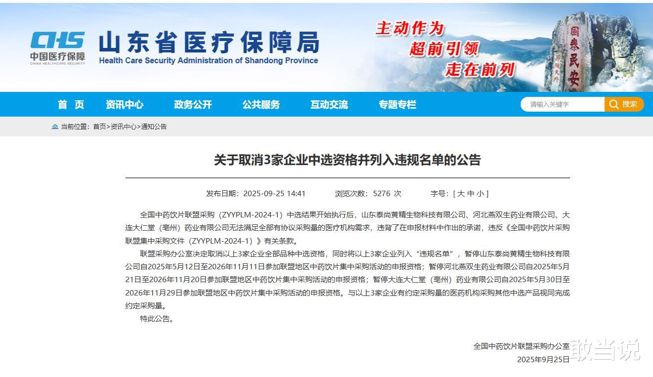 全国中药饮片联盟采购办公室的一则公告,将3家企业踢出中药饮片集采。日前,全国中药饮片联盟采购办公室发布公告称,山东泰尚黄
