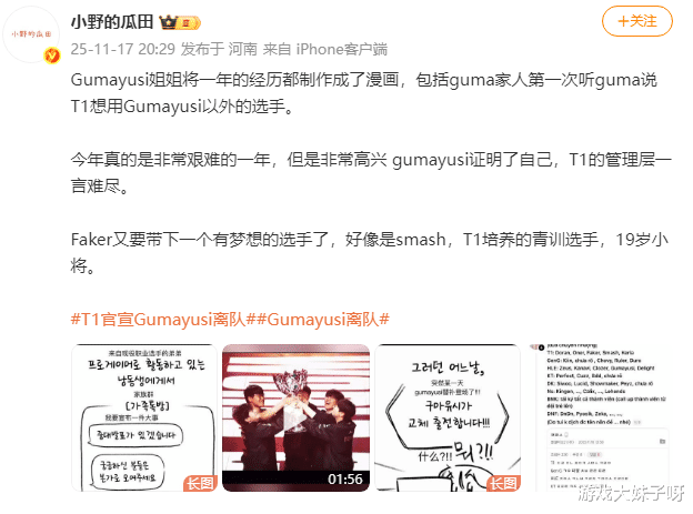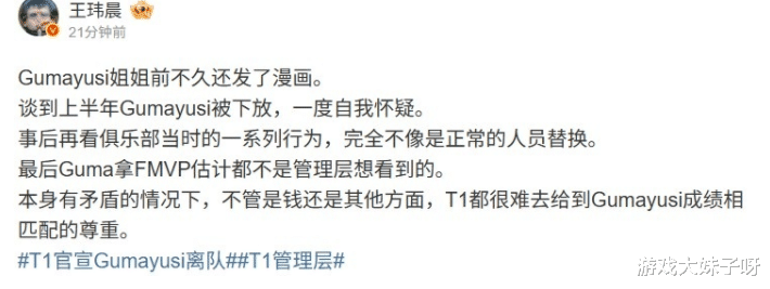在离队消息公布后,圈内知名电竞从业者王玮晨也发表了自己的看法,他表示:“Guma拿FMVP可能并不是管理层最希望看到的结果。”他认为,在内部关系紧张的前提下,无论是续约条件还是团队氛围,T1都可能难以给予Gumayusi与其成绩相匹配的认可与资源,这番话虽不是官方立场,却反映了业内对选手与俱乐部关系紧张的一种普遍猜测。