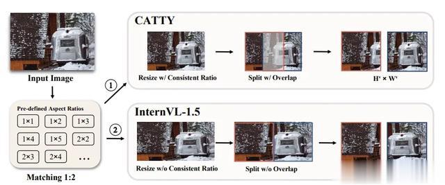 CATTY的具体步骤如下:i) 首先,预定义图像可以分割成的最大图块数(在我们的实验中设置为 8)。ii) 列出图块数不超过最大图块数的所有整数分辨率组合。iii) 给定一个高度为H和宽度为W的图像,我们寻找与其分辨率最近的整数分辨率,乘视觉编码器的图像尺寸,得到目标图像的高度Hr和宽度Wr,并通过以下方式将图像大小调整为目标大小 (Ht × Wt ):