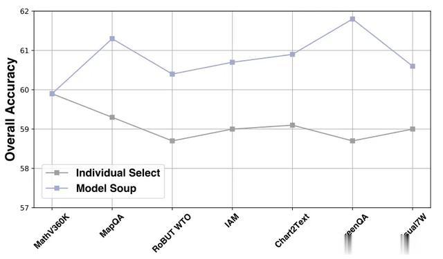 这幅图展示了在相同基础数据集基础上,使用 Individual Select 和 Model Soup 加入单个数据集的性能差距。表明当通过 Individual Select 的方式选择并添加额外的指令调整数据集无益时,使用 Model Soup 的融合方式可以显著提高性能。