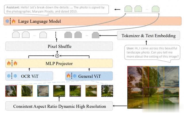 除了使用CATTY分割的图块,我们还加入了整体图像的缩略图来捕获整体上下文信息。在将视觉编码器输出的特征对齐并传入到大型语言模型之前,我们InternLM-XComposer2-4KHD[7]中的pixel-shuffile,设置下采样因子为 0.25,减少图像特征的序列长度以提高效率。