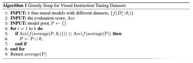 Greedy Soup首先根据评估分数对微调后的模型进行降序排序。接着遍历排序后的模型。对于每个模型,我们计算其权重与模型池中当前所有模型的权重的平均值。如果评估分数提高,则模型将添加到池中。最后,我们对池中所有模型的权重进行平均,以获得更强的模型,表示为 f(θs)。下表概述了 Greedy Soup 的步骤。