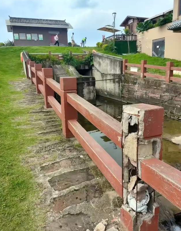 额外的好处还有,万一栏杆断裂,游客不慎落水,还能用漂浮在河道上的水泥栏杆当救生圈。