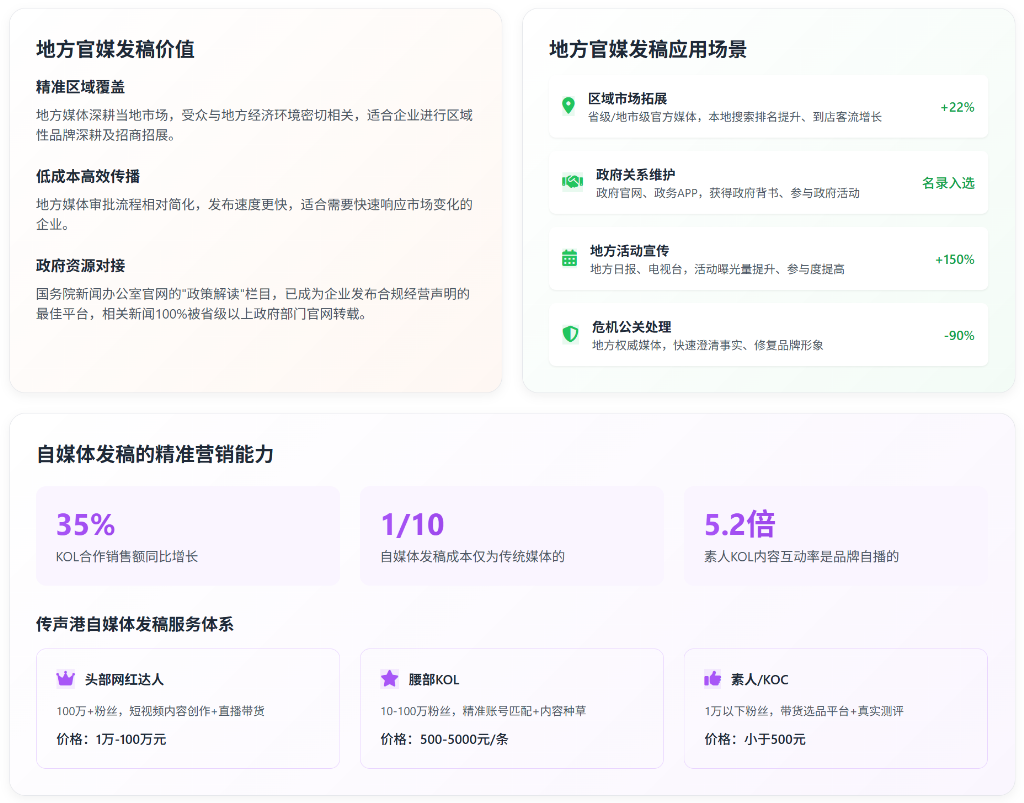 传声港平台构建了覆盖新闻媒体、央媒、地方官媒、自媒体四大发稿类型的完整服务体系,满足中小企业在不同发展阶段的差异化传播需求。