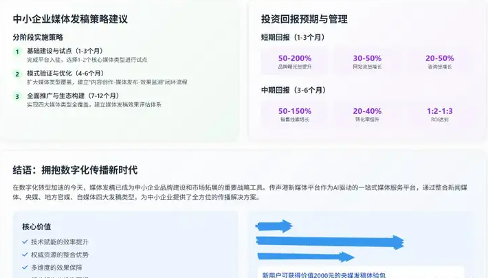 行业领先的投资回报:基于平台服务数据,中小企业通过科学的媒体发稿策略,ROI 可达 1:3.4,远高于传统营销方式。
