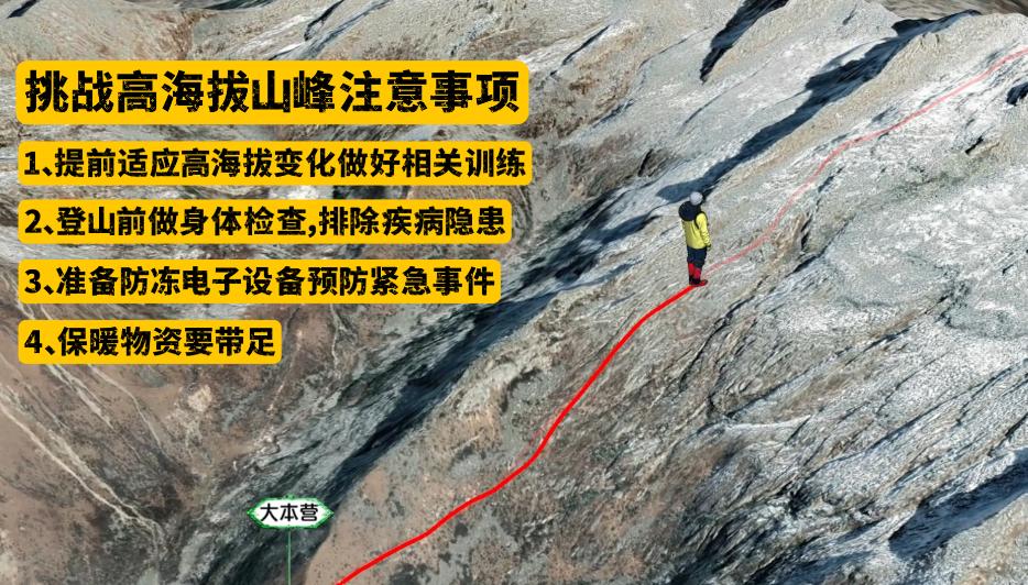 提前适应高海拔变化,并做好相关训练登山前,做好身体健康检查,排除疾病隐患准备防冻的电子设备,预防发生紧急事件时,因手机冻坏耽误救援保暖物资要带足