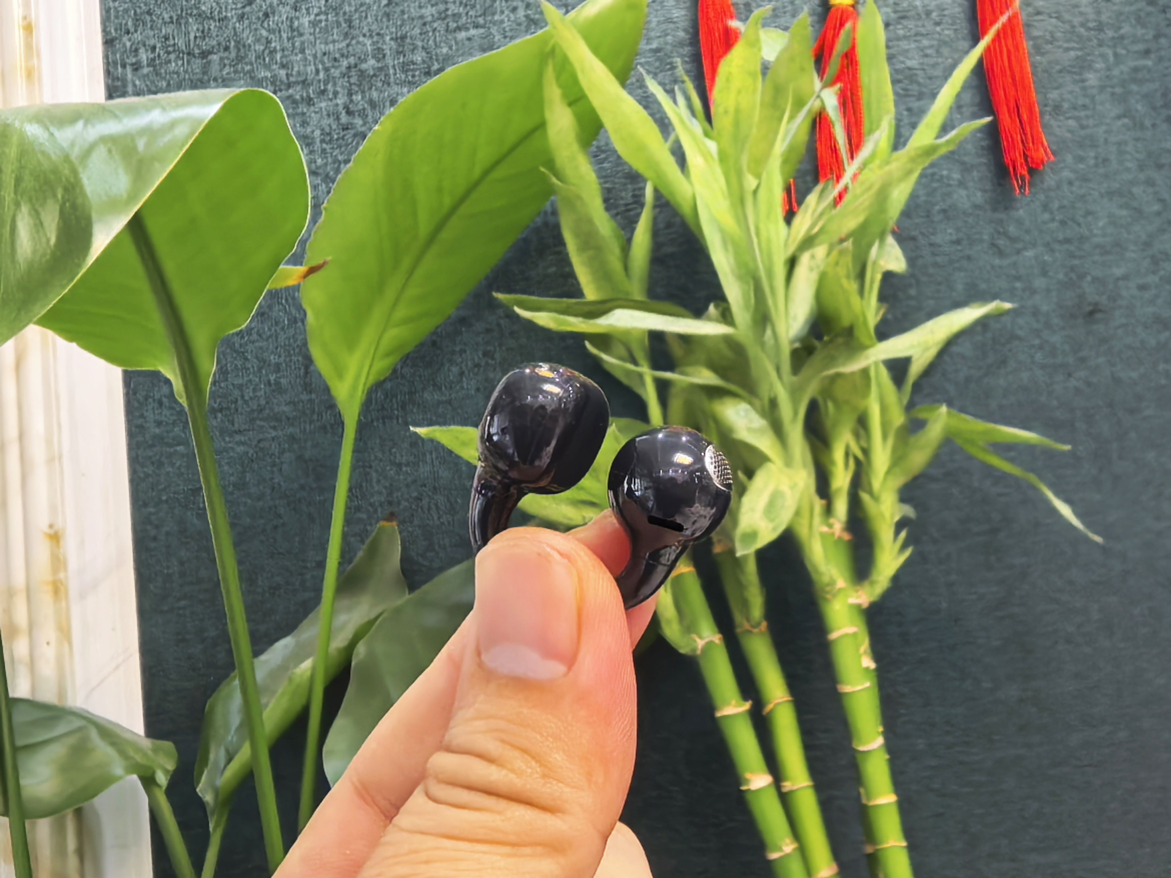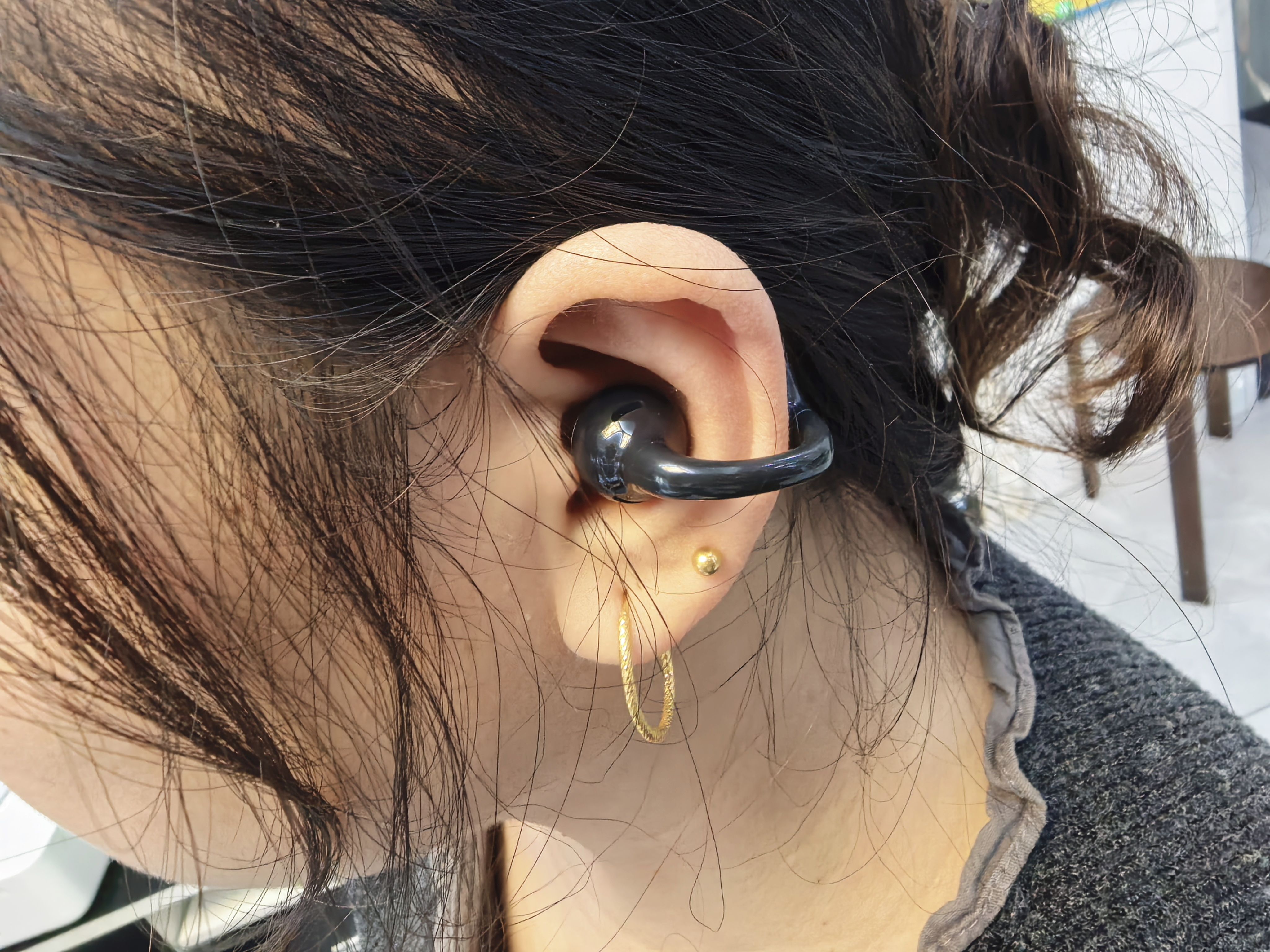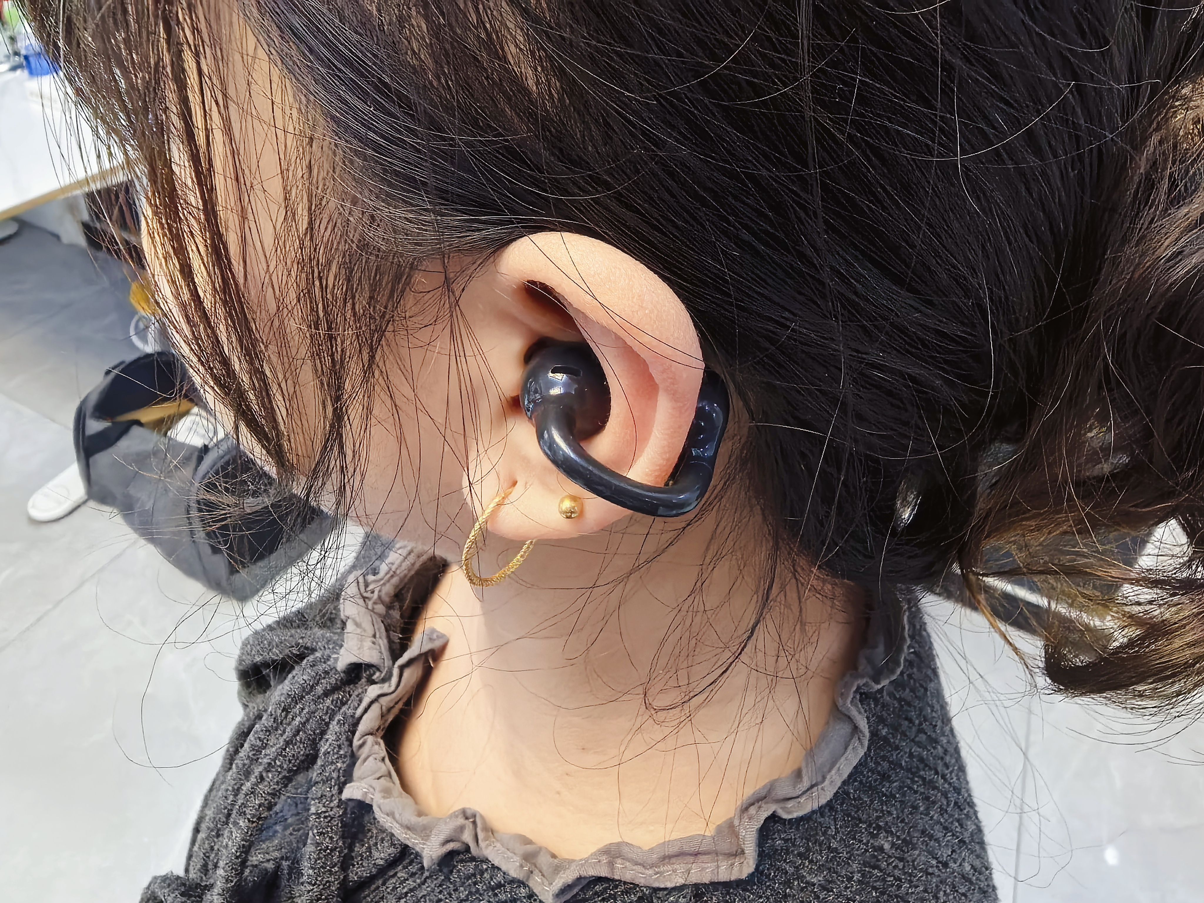 耳机本体比想象中更为小巧,亮面材质不易留下汗渍,比较容易清理。圆润的耳夹设计贴合耳廓,镍钛合金丝材质的连接部分柔软有弹性,佩戴时几乎感觉不到重量,远看仅如一个小方块悬挂耳畔,完全没有传统挂耳式耳机的笨重感。