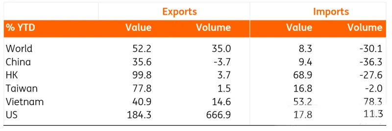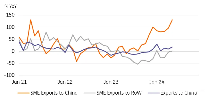 日本一直是美国对华半导体制裁的积极参与者,因此我们最初预计今年日本对华出口将受到负面影响。然而,事实证明,日本对华出口,尤其是半导体制造设备,大幅增长。