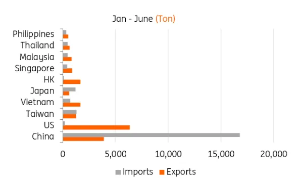 例如,越南正在成为半导体领域更重要的贸易伙伴。这可能是中美技术贸易紧张局势升级的结果;随着芯片制造商的供应链多元化,越南似乎是最大的受益者。与此同时,今年上半年对中国的芯片出口有所复苏——但这主要是受价格效应的推动。中国和香港仍然占据半导体行业的中心位置,而韩国与中国和香港的贸易量自 2022 年以来一直在萎缩。