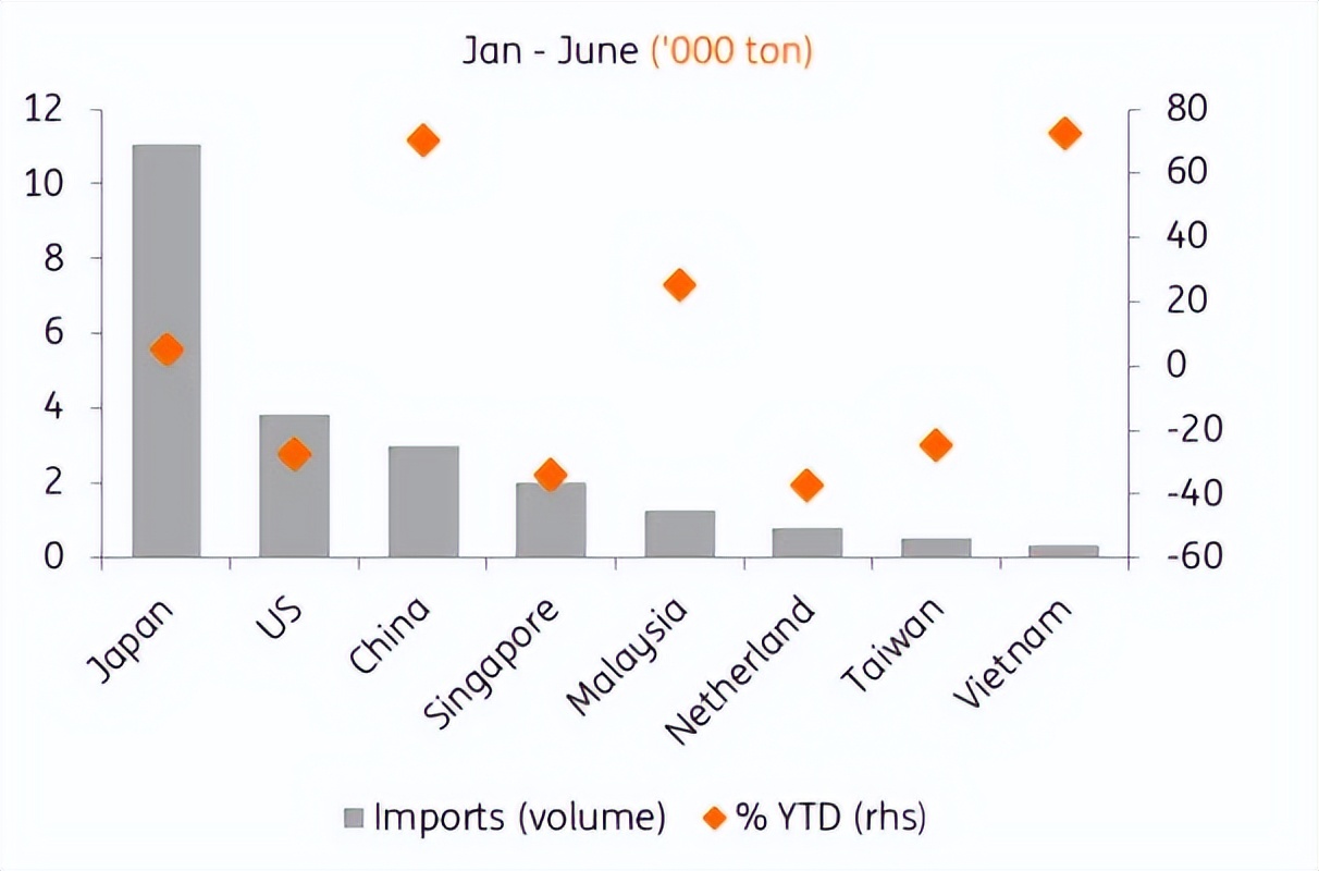 Japan has been an active participant in U.S. semiconductor sanctions against China, so we initially expected a negative impact on Japanese exports to China this year. However, Japan's exports to China, especially semiconductor manufacturing equipment, have proved to be surging.