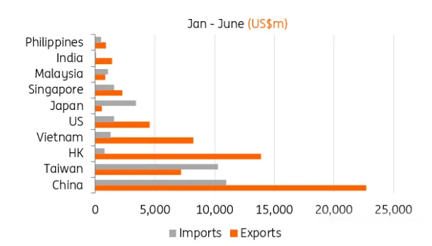 韩国出口数据显示,其十大芯片贸易伙伴都在亚洲,进一步巩固了亚洲作为全球芯片中心的地位。