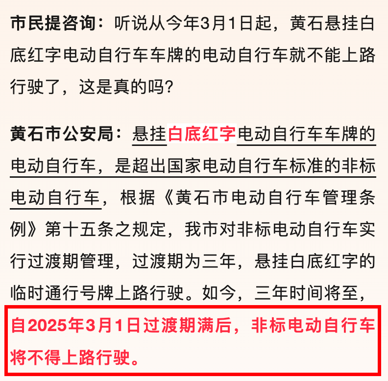 近日,《黄石日报》报道,当地交管部门确认,从今年3月1日起,非标电动车不得上路。