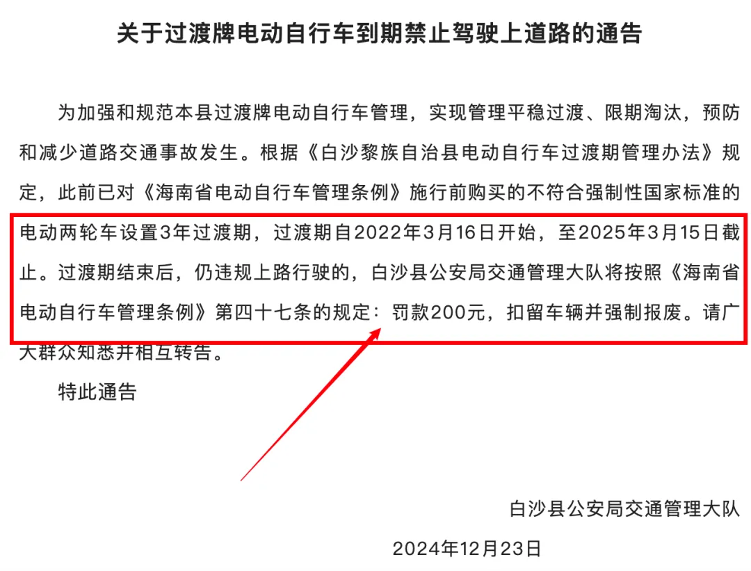 1、此前当地交管部门就已发布《关于过渡牌电动自行车到期禁止驾驶上道路的通告》,明确根据《白沙黎族自治县电动自行车过渡期管理办法》,对《海南省电动自行车管理条例》实施前购买的不符合强制性国家标准的电动车两轮车设置的3年过渡期,将在2025年3月15日截止。