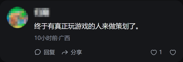 评论区一条高赞评论说得特别到位:“终于有真正玩游戏的人来做策划了。” 谁会讨厌一个十年老玩家背景、还这么有趣、这么听劝的制作人呢?