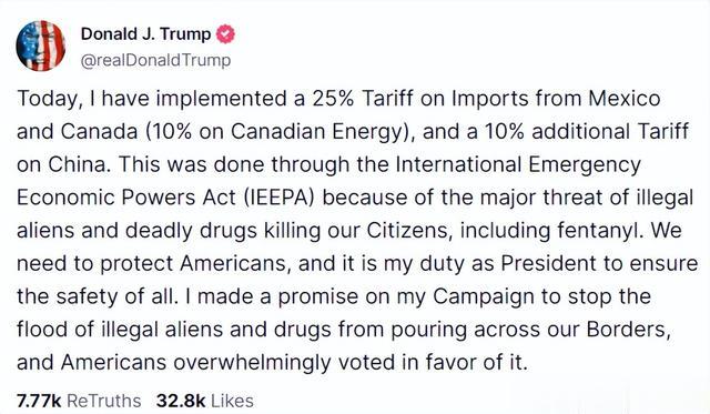 特朗普在周六发布到Truth Social 的消息中表示:“今天,我对从墨西哥和加拿大进口的产品征收 25% 的关税(对加拿大能源征收 10%)。”,特朗普表示他之所以使用 IEEPA,“是因为非法移民和致命毒品(包括芬太尼)对美国公民的威胁很大。我们需要保护美国人,作为总统,我有责任确保所有人的安全。”