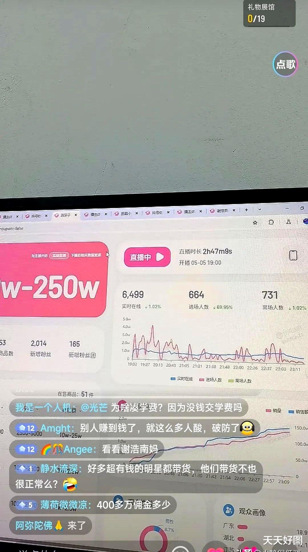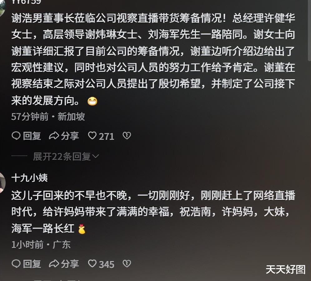 4 月 19 日,她开启首场直播秀,谢浩男连夜从南京赶到杭州,现身直播间给妈妈惊喜并助力。开场便有10粉丝支持, 10000 件夏被几秒内被“抢光”,追加一万单也瞬间售罄。