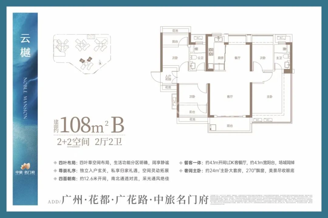 108方四房二卫,四叶草布局,三开间朝南,南北对流,同样是利用花池、阳台等增大面积。