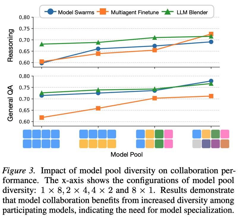 除了扩大规模之外,我们也探讨在同等规模的情况下,模型多样性的作用。我们发现在模型数量均为 8 的情况下,8 个多样的 LLM 协作显著优于 8 个同质的 LLM 协作,揭示了多个模型之间取长补短、互相成就的重要性。