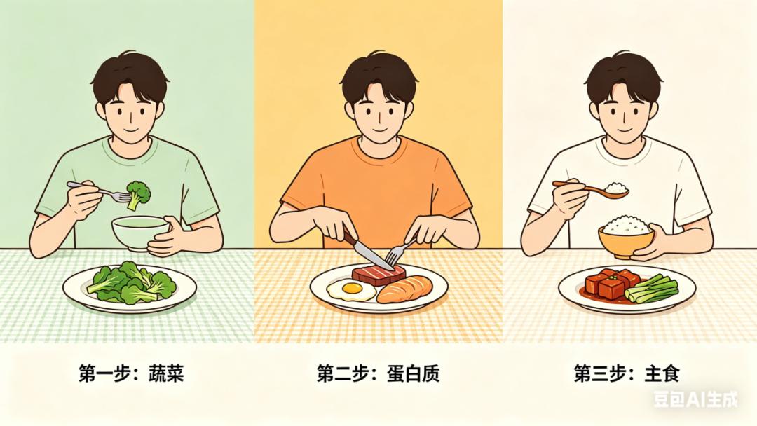 建立固定进餐时间,避免漏餐、延迟进餐,若因特殊情况无法按时进食,需提前15-30分钟补充适量碳水化合物(如半片面包、1小杯牛奶);控制每餐摄入量,避免忽多忽少,做好进食顺序(蔬菜→蛋白质类食物→主食);