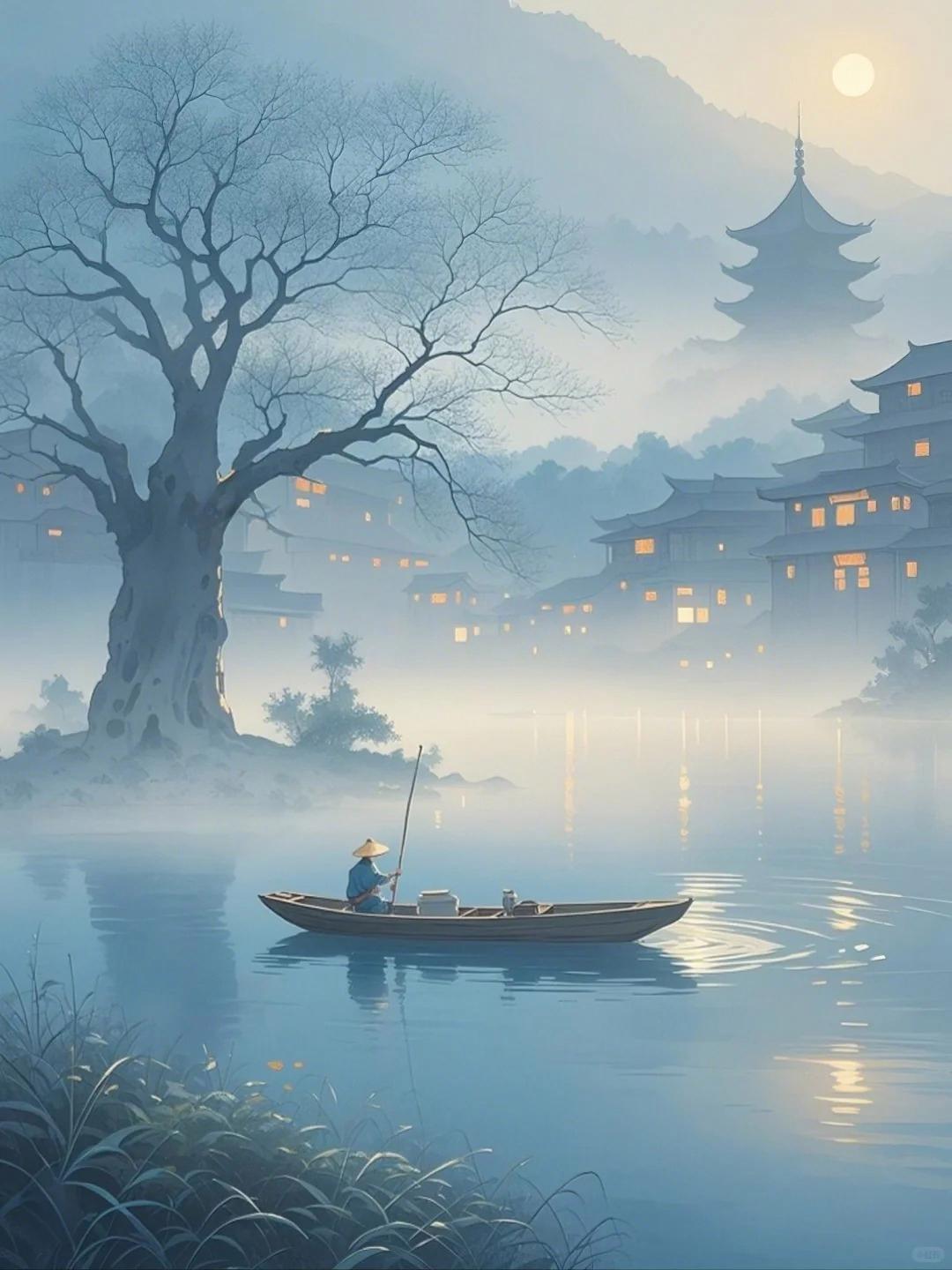 火光在山间闪烁,看起来朦朦胧胧。渔夫在水上唱歌,歌声飘得很远,听起来悠扬动听。