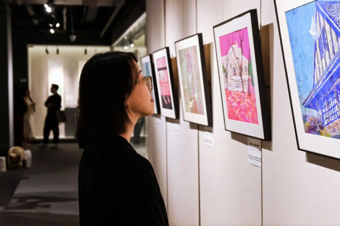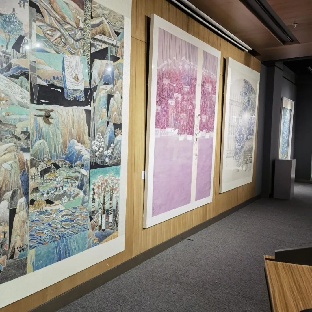 展览空间布置极具节奏与沉静之美。朵云轩的光影氛围与岩彩作品的层次质感相互映衬,观众在作品的温度、密度与深度之间,感受到色彩在时间中氧化、沉淀与再生的过程。每一幅作品都像一块被思想切开的矿石,记录着精神的温度与时间的痕迹。