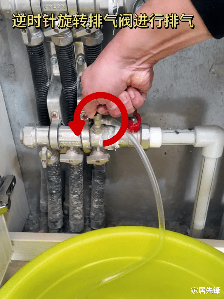 然后我们再将所有的分支进水阀关闭,只保留一个回路,然后缓慢的打开该路的进回水阀,轻轻打开排气阀。