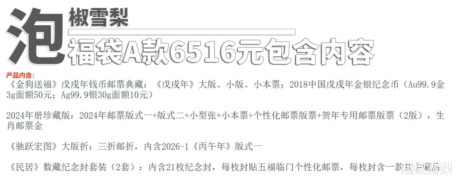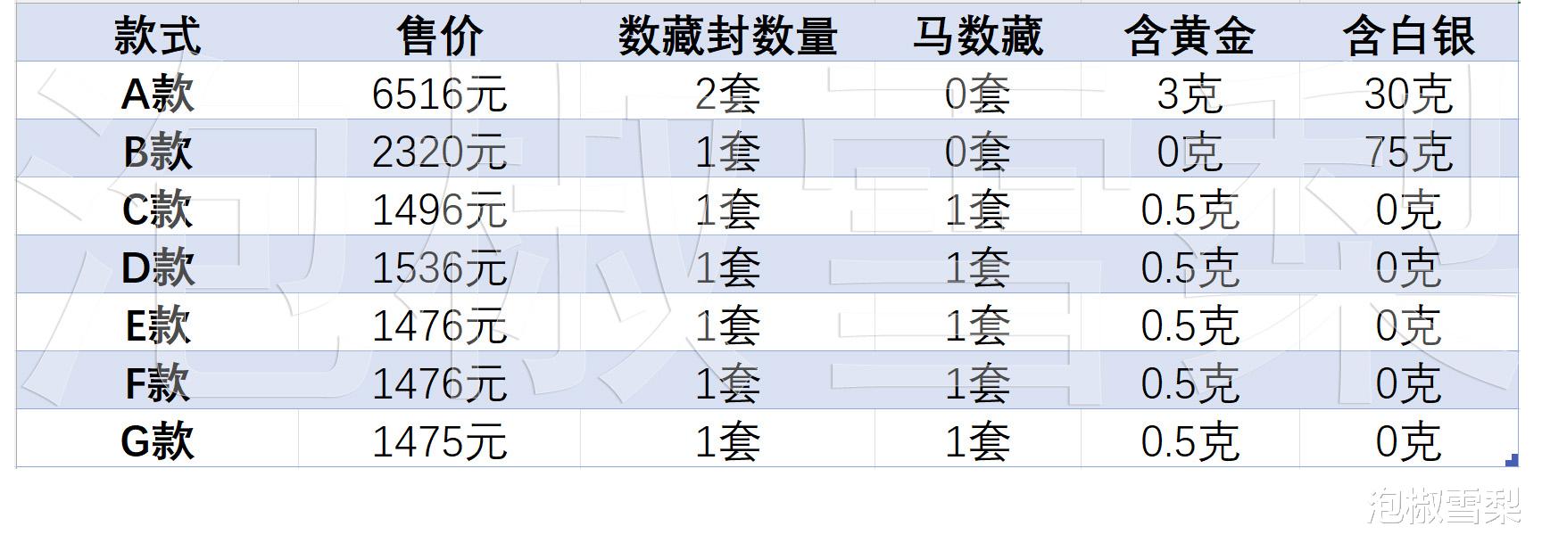 比较有价值的是金银币和马年数藏小版,其它均是常规邮品和周边产品,至于值不值这个价,大家简单计算一下就知道,以下是七款产品中包含经济价值较高产品的数量对比。