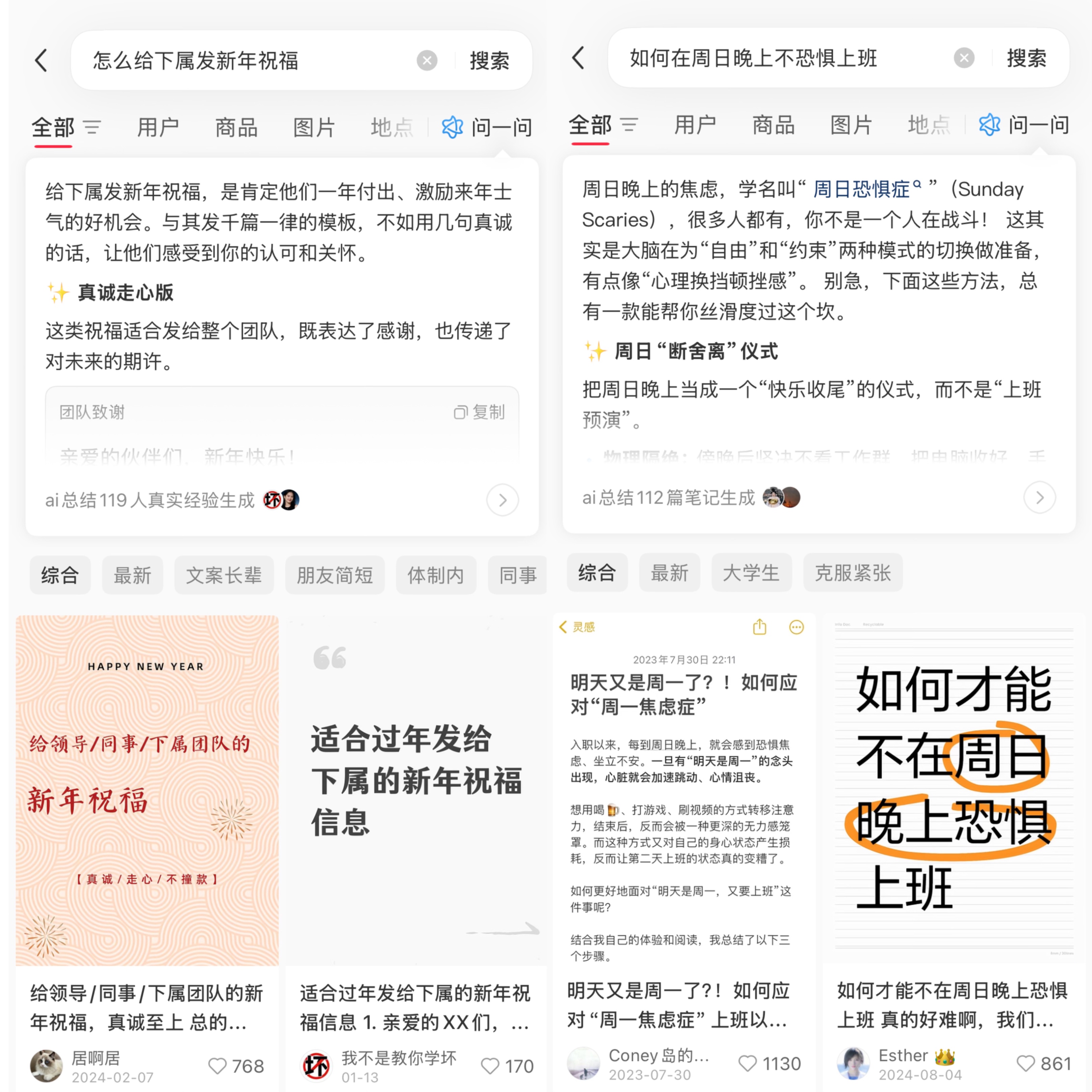 问搜把这两种能力放在同一个入口:用户既能看到熟悉的双列内容,也会得到一段基于社区真实笔记提炼出的总结。这个总结是对分散经验的再组织,它让信息更清晰,但不改变信息的真实来源。