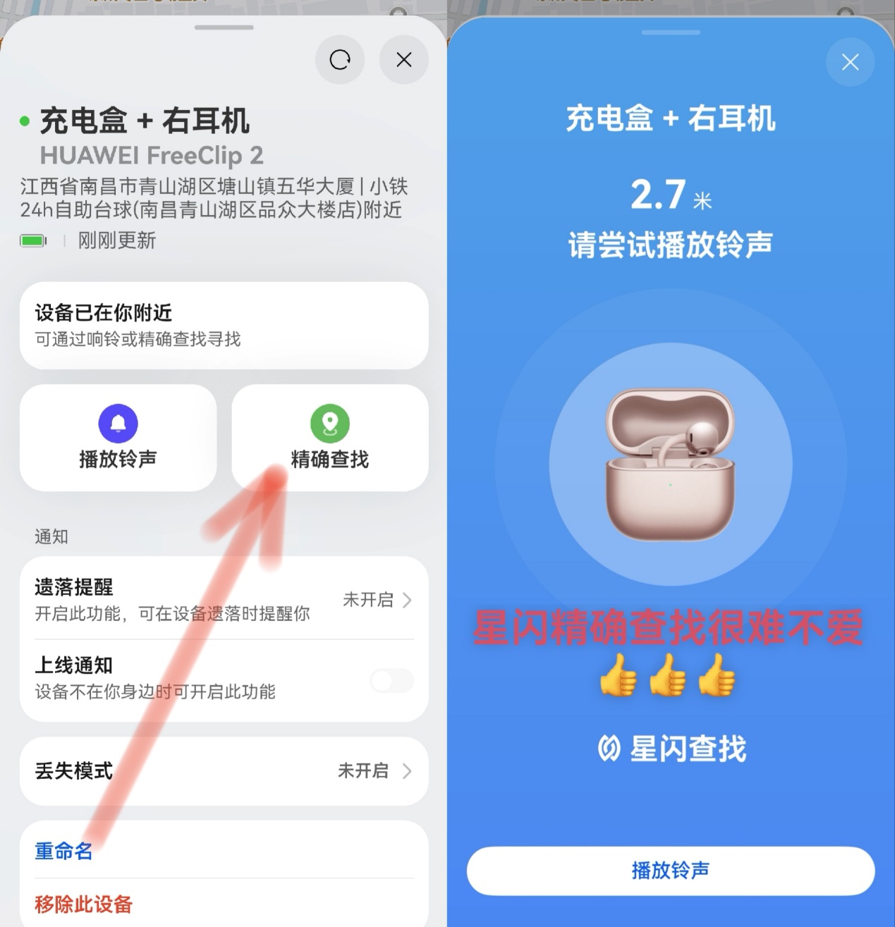 跟随导航到设备附近时,如果你的手机支持星闪查找,还可以通过“精确查找”能力更精准找到设备。就算你的设备被什么东西挡住了或者掉在缝隙里找不到,还可以远程控制让它响铃,哪怕开了静音也会以最大音量响起,帮你在角落里找到它。