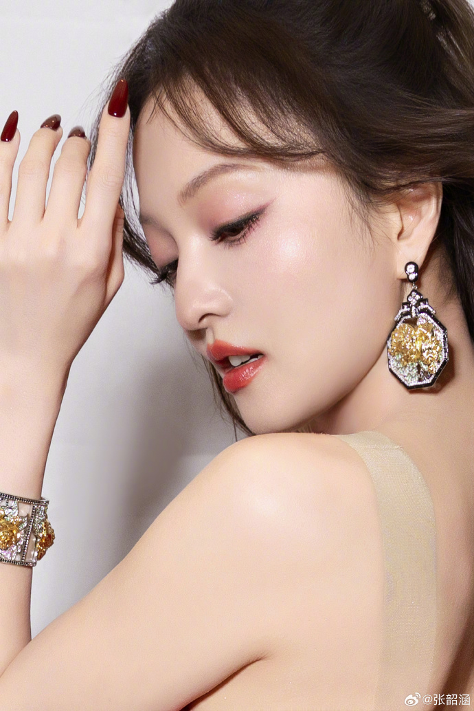 如果说粉白造型是她舞台里的 “梦幻侧写”,那红色礼服则是她藏在嗓音里的 “热烈底色”。这张里,她穿的红色礼服是丝绒材质,领口是抹胸设计,耳侧坠着枚琥珀纹理的耳饰,刚好和唇色的正红呼应。她唱快歌时的嗓音向来有 “穿透力”,这丝绒红的厚重感,刚好能接住她嗓音里的热烈,连手抵额的动作,都带着唱跳舞台的张力。