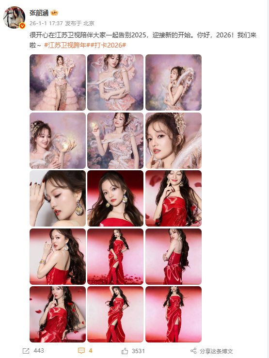 张韶涵以清亮 “铁肺” 嗓音出道,早年凭《欧若拉》《隐形的翅膀》奠定唱将地位,近年跨年晚会的舞台造型常以 “梦幻华丽” 出圈,总能把歌曲气质揉进妆造细节里。2026 年元旦,她在江苏卫视跨年晚会后发布这组动态,两种风格的造型,刚好对应着她舞台里的 “梦幻与热烈”。