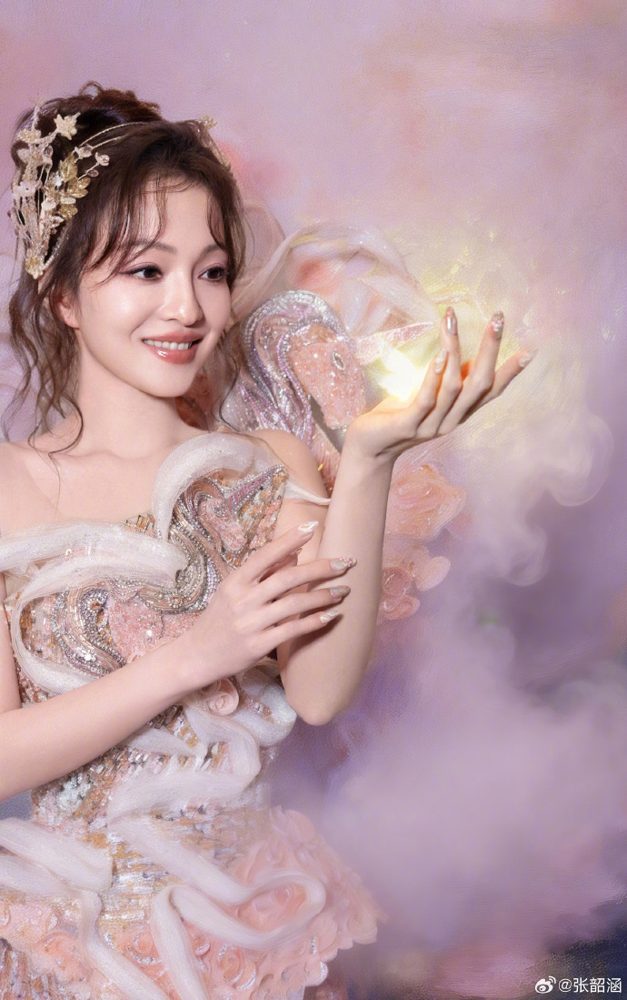 她抬手持着光球,粉白礼服的胸口处绣着浅粉花朵,花朵的纹理和裙摆的刺绣连成一片。她对舞台造型的 “整体性” 向来苛刻,比如妆造的纹样会贯穿全身。现在这持光球的动作里,胸口的花朵随着呼吸轻动,连光球的光都刚好落在纹样上,是把 “细节的统一”,变成了舞台的 “记忆点”。