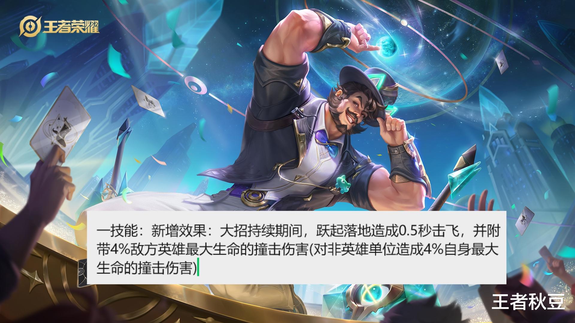 程咬金纯加强,一技能新增大招持续期间跃起落地后造成0.5秒的击飞和附带4%敌方最大生命值的伤害,对非常也有伤害。程咬金有了控制效果后,打团能力变得更强,也有了更多的操作选择,可以逃离也能进攻。