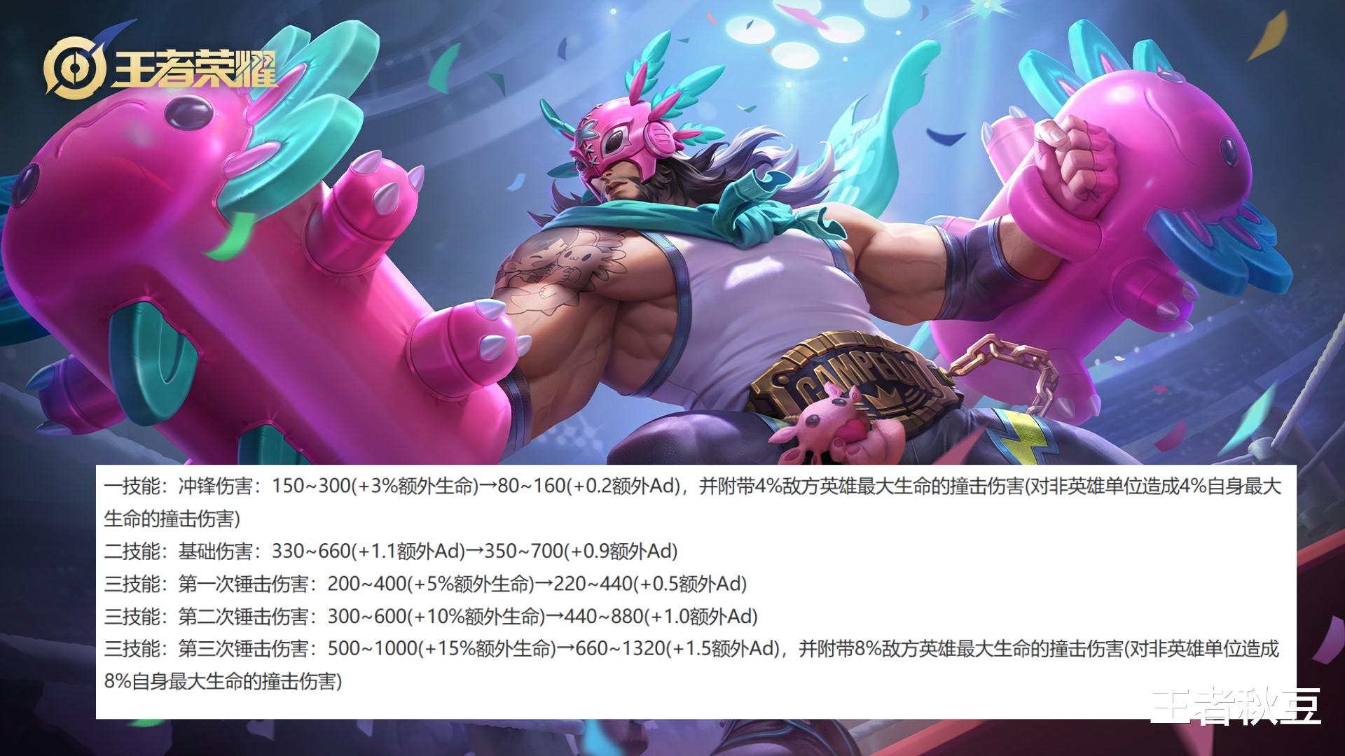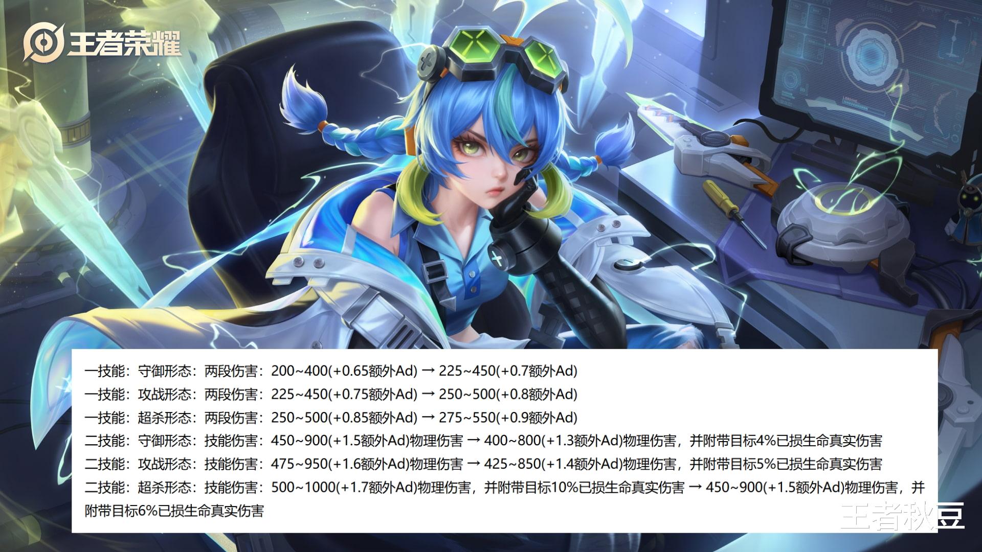 蚩奼一技能伤害全面提升,三种形态都提升了25~50点伤害+0.05AD。二技能守御形态和攻战形态都新增附带已损生命值的真实伤害,看似挺好,但是二技能超杀形态的基础伤害和额外AD还有已损伤害都降低了,超杀形态作为主要输出、消耗、和收割手段,总的来看是大削弱。