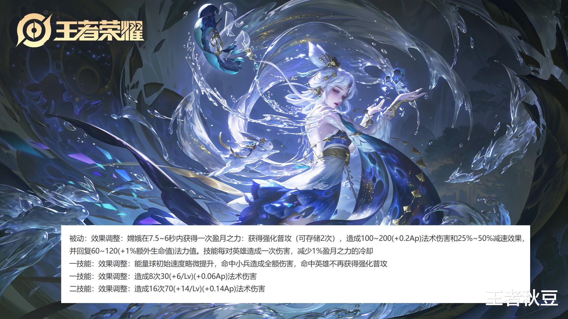 嫦娥被动调整随时间获得可以存2次的强化普攻,造成伤害和减少,技能对英雄造成伤害会减少获得强化普攻的冷却。移除了一技能命中命中不再获得强化普攻的设定。经之前体验服测试,这个强化普攻是自己打出去的,不能触发巫术法杖,因此嫦娥的出装将需要调整。
